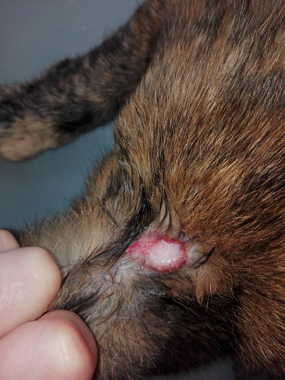 On March 1, the lesion appeared much smaller; a few erythematous foci remained in the center of the lesion, erythema and crusts at the edge had disappeared, and coat regrowth was already noticeable.