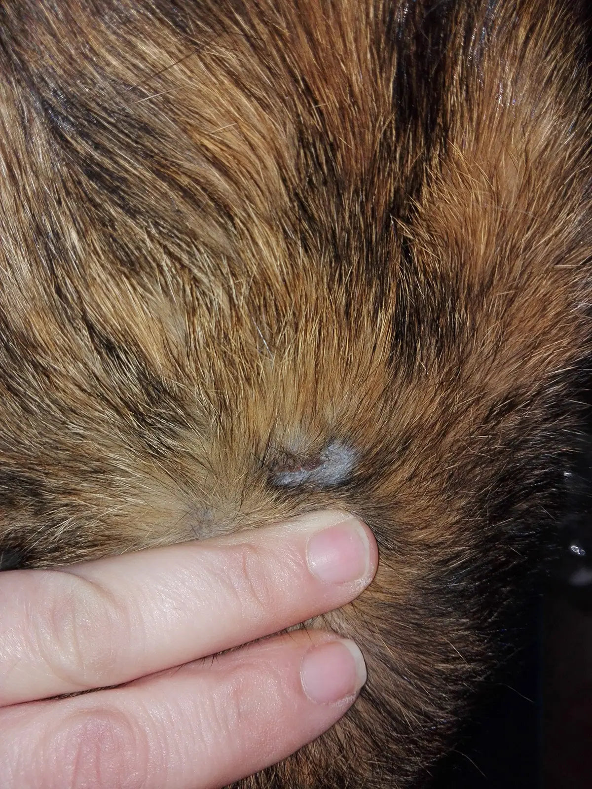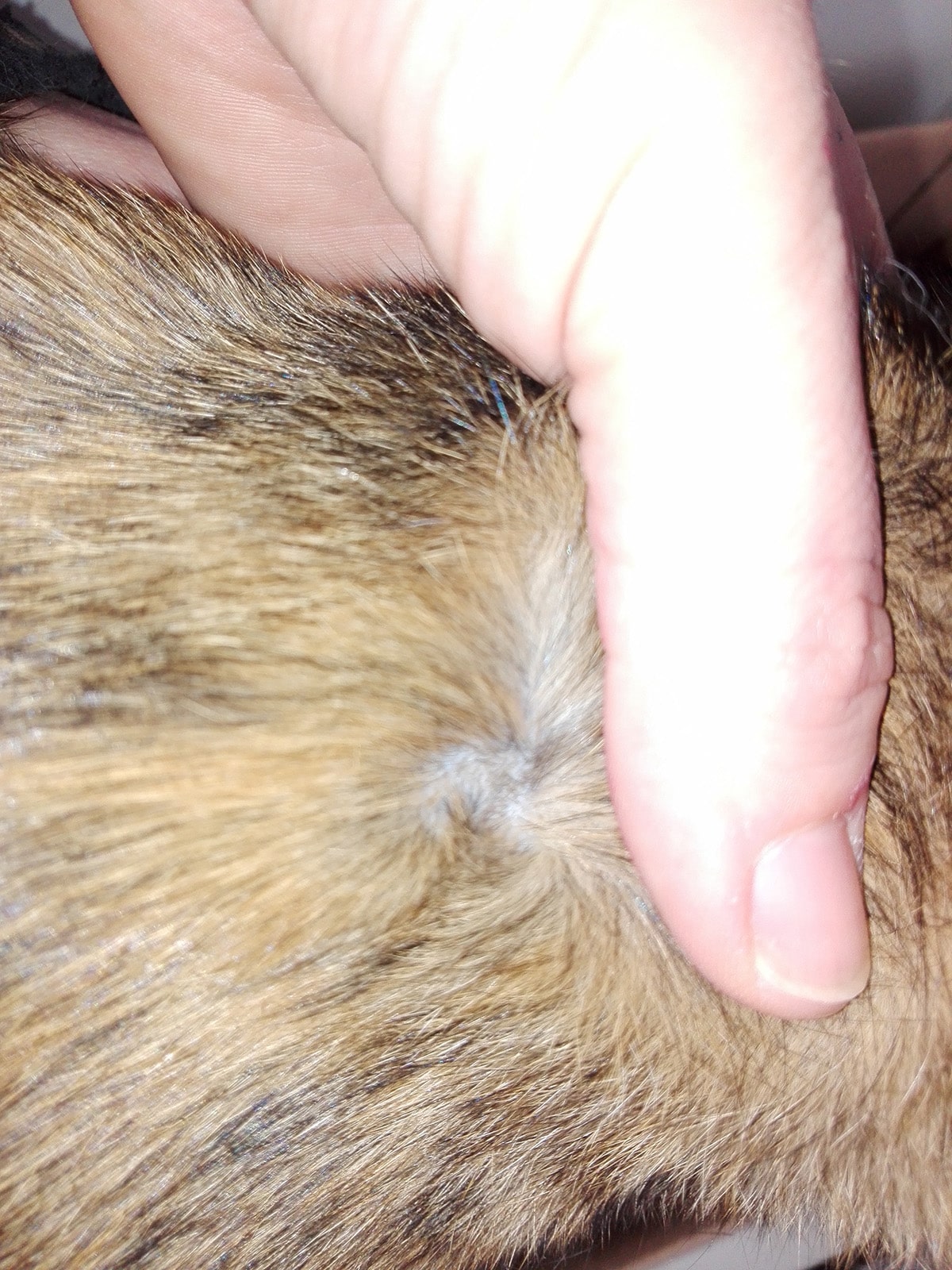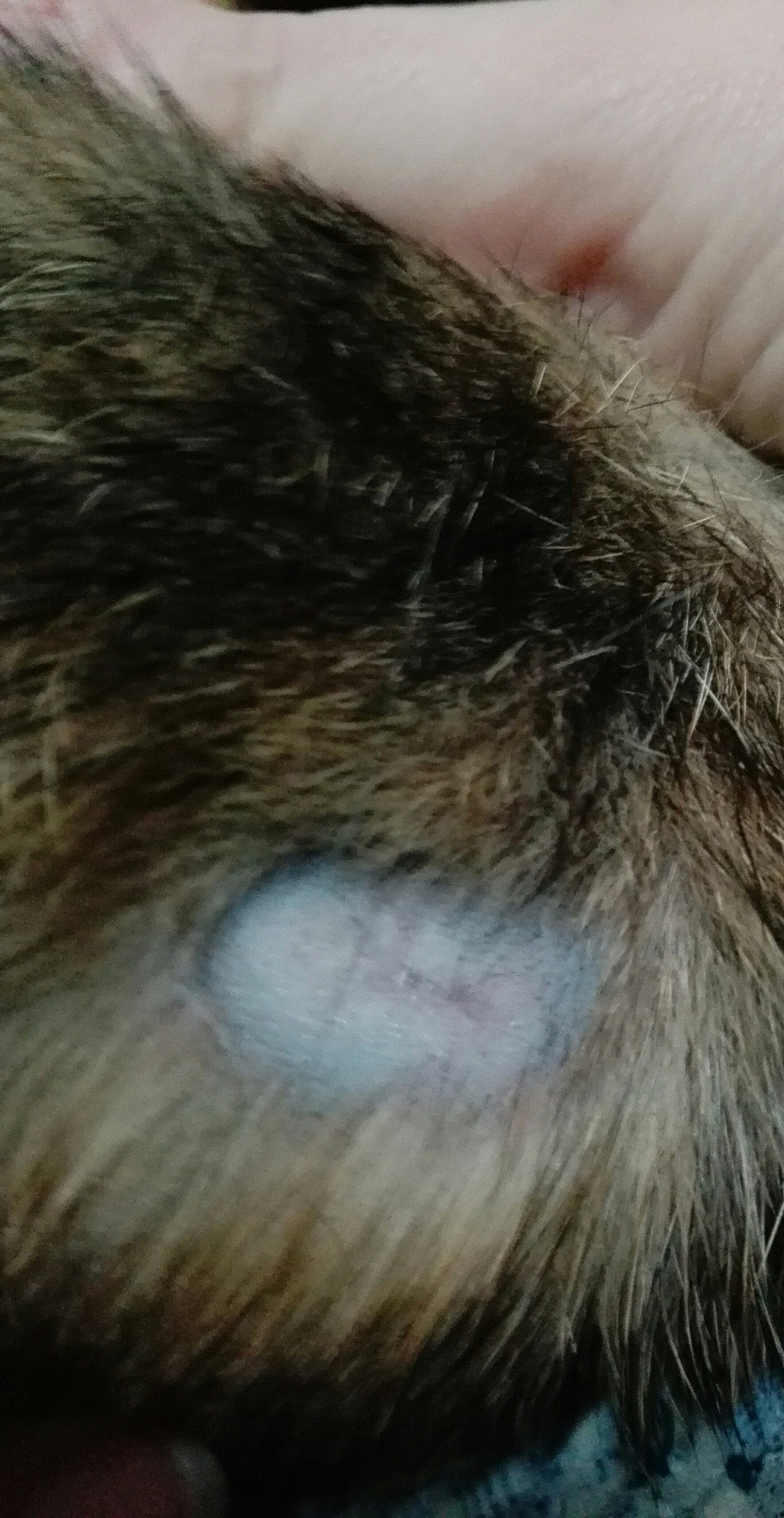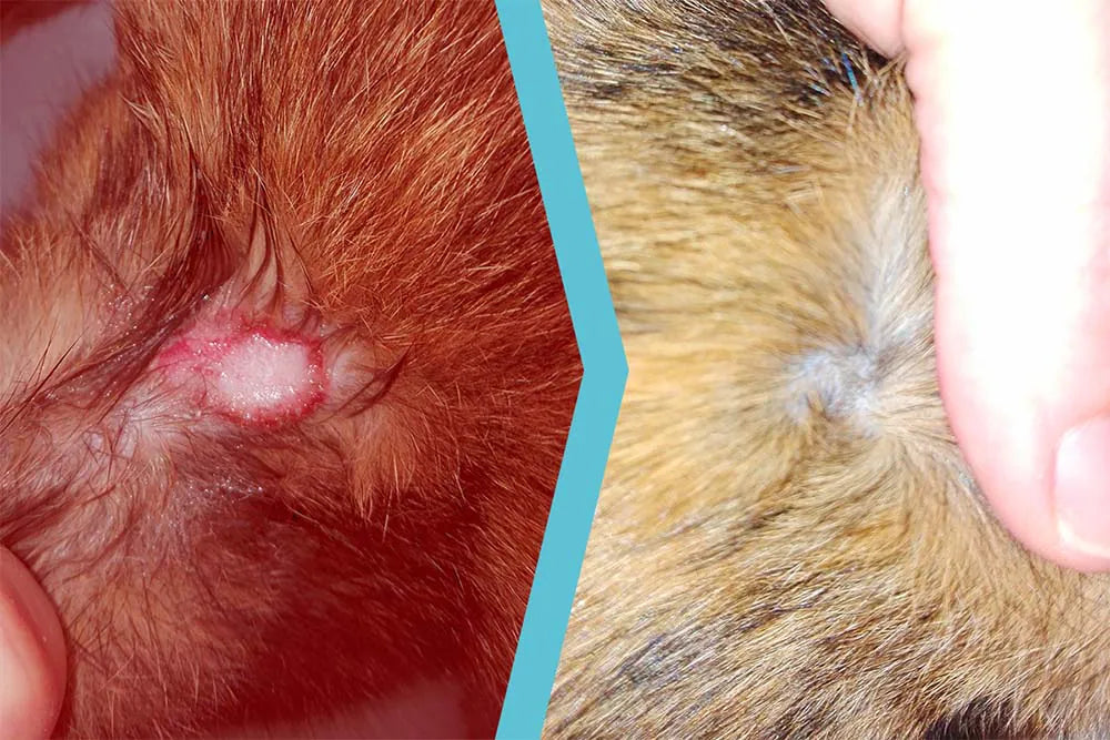 After 40 days, the lesion no longer had crusts; only dandruff-like scales were visible on the skin at the hair base, and the coat was growing back strongly.